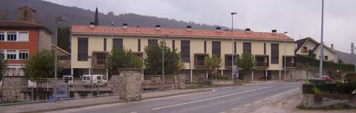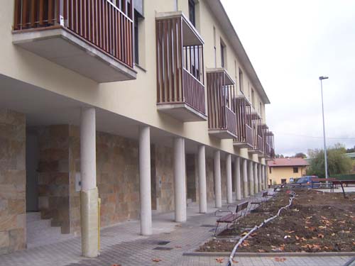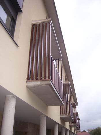 CRITERIOS COMPOSITIVOS: Se trata de adaptarse a la topografía, con una sección transversal que absorva el gran desnivel. Fachadas de mortero monocapa en tonos crema, que entonen con las edificaciones adyacentes, con carpinterías de aluminio lacado color gris grafito en ventanas. Se trata de crear una fachada uniforme y continua, en el que destaquen los balcones de las cocinas. Las losas de hormigón que configuran los vuelos, atrapan carpinterías de madera en celosía. Los paños de mortero pasan por encima y debajo de los vuelos; en el forjado de cubierta aparece como prolongación un vuelo continuo, alero, que protege las ventanas de plantas elevadas.En los patios, se repiten los vuelos.