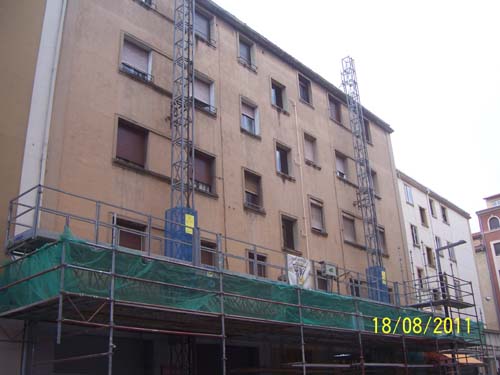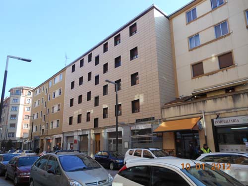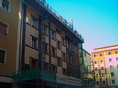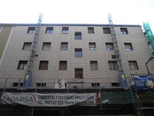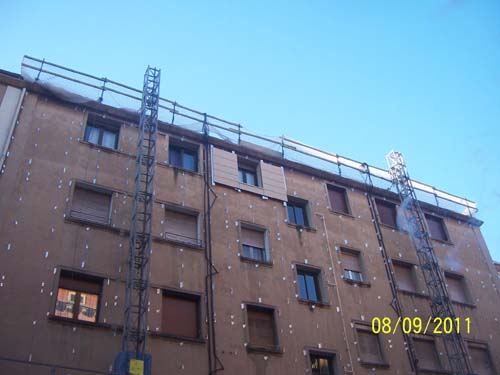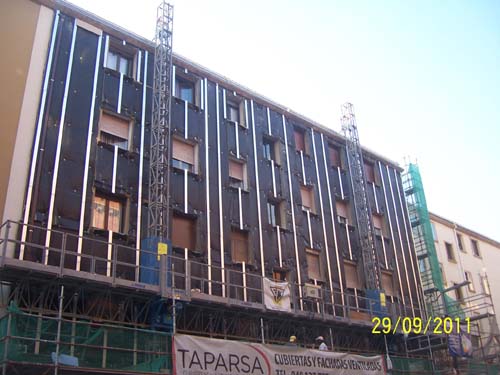 Las fachadas: para la realización de los trabajos en fachada y cubierta fué necesaria la colocación de andamiaje tanto en la fachada delantera de la calle Gorriti, como en la fachada trasera en el patio. En la fachada del patio además se eliminaron los tendederos existentes, y se sustituyeron las instalaciones que discurrían por fachada, de telecomunicaciones. Tanto en la fachada principal como en la del patio, se realizó la limpieza de aleros mediante la proyección de agua a presión para eliminar hongos, musgo, etc. consiguiendo así una limpieza del sopote, para posteriormente realizar las reparaciones de albañilería, la imprimación y el pintado de los aleros y su impermeabilización, mediante lámina de PVC, con aislamiento de lana de roca en la cubrición de techos de locales habitables (miradores de salones a patio). En la fachada a patio, se eligió un sistema SATE, mediante placas de poliestireno expandido acabado de mortero fratasado en color blanco, debido a su óptimo comportamiento y adecuación. En la fachada delantera, orientación Oeste, se eligió un sistema de fachada ventilada, mediante perfilería de aluminio, aislamiento de lana mineral y aplacado cerámico tipo NBK. Con ello, se consigue una fachada de un gran nivel de acabado, un óptimo aislamiento térmico y acústico (la calle es una vía de tráfico rodado), con las ventajas de la ventilación exterior en una orientación con nivel de soleamiento importante. Con el fin de igualar el aspecto general, se realizó el esmaltado de carpinterías. La cubierta: la reforma de la cubierta consistió en el desmontaje de la cubierta de teja original, manteniendo tanto la solívería como el tablero de madera. Se colocó un doble aislamiento, tanto en el falso techo del último piso como encima del soporte de la cubrición, con ventilación de la teja y del local bajocubierta no utilizable, todo ello acabado con teja cerámica mixta. La obra fué realizada por la empresa Taparsa.