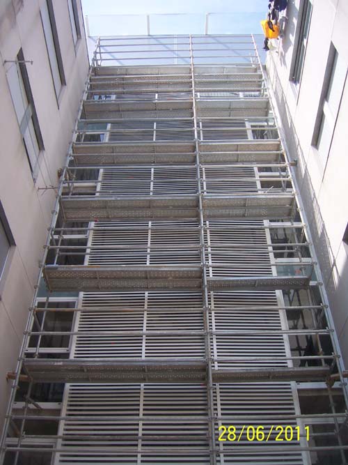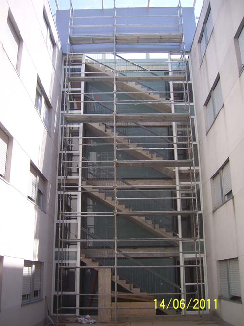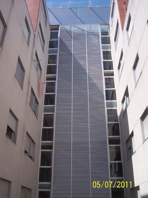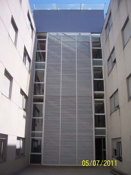 Portales y porches de acceso, problemas detectados: 1. puerta de garaje, excesivamente débil en su estructura y acabados, para las dimensiones de luz que soporta. 2. cierre de chapa plegada, es escalable y endeble. 3. puerta de madera de portal, mala vejez del material. Se persigue: 1. modificar el sistema de cierre del garaje, en puertas de acceso, para un mejor funcionamiento, y que evite daños por vandalismo. 2. modificar los acabados en porches, con el fin de reducir el riesgo de actos vandálicos sobre el edificio. Se propone: 1. sustituir la puerta de garaje, por otra de dos hojas motorizadas (<2.00m de luz cada una), ejecutadas mediante perfilería metálica y lamas de chapa de acero plegada no escalables. 2. eliminar los cierres de chapa plegada, y sustituirlos por un levante de ladrillo caravista, en color similar al de fachadas, con junta de mortero en llagas y tendeles. 3. colocar nuevas carpinterías de acero en locales de servicio y acceso peatonal a garaje, y una de acero inoxidable en acceso a portal. Los premarcos de todas las puertas, serán perfiles de acero laminado, anclados a los dos forjados y a la fábrica. 4. el sistema de apertura de la puerta de portal (de acero inox), será el siguiente: apertura hacia el porche // desde el exterior, apertura con cerradura y tirador // desde el interior, pulsador antipánico horizontal, integrado en perfil horizontal (con esto último, se trata de evitar el desgaste que sufren las manillas en este tipo de puertas). En los PORTALES 1B y 2B, los problemas específicos detectados son: 1. el porche tiene unas dimensiones, ancho / fondo, que le dan una excesiva profundidad, convirtiéndose en un sucio rincón. 2. cierre de chapa plegada, contra el garaje, es escalable y endeble. Se persigue: 1. modificar las dimensiones del porche, reduciendo su fondo. Se ha consultado con el técnico municipal de Berriozar, y dado que el porche de planta baja, ya estaba consumiendo aprovechamiento, se considera que no hay incremento del mismo. 2. modificar los acabados en porches, con el fin de reducir el riesgo de actos vandálicos sobre el edificio. Se propone: 1. ocupar el porche de acceso con un espacio previo de portal, y un cuarto de limpieza, sin modificar posiciones de cuartos de instalaciones 2. se deberá desplazar la CGP, hasta lindero a calle, con modificación de acometida y derivación a contadores. 3. colocar nuevas carpinterías de acero en locales de servicio (teleco), y una de acero inoxidable en acceso a portal. Los premarcos de todas las puertas, serán perfiles de acero laminado, anclados a los dos forjados y a la fábrica. 4. puerta de portal, igual que portal 1 de capítulo anterior. En el INTERIOR de PORTALES, los problemas detectados son: 1. materiales propensos a sufrir actos vandálicos. 2. falta de iluminación en el interior, y colores oscuros que generan espacios poco luminosos. 3. las puertas de contadores eléctricos y accesos a garaje, no cumplen normativa CTE-SI. Se propone: 1. eliminar los frentes de chapa plegada y el falso techo de lamas metálicas. 2. que los paramentos verticales sean, un zócalo de cerámica más resistente y de menor coste de mantenimiento; nuevo falso techo de cartón yeso. 3. pintar con colores claros en yesos y techos. 4. incrementar el nivel de iluminación en el portal. 5. sustituir las puertas de locales de contadores y accesos a garaje, por puertas de acero pintado, que sectoricen conforme al CTE-SI. 6. sustituir los buzones existentes, por nuevos empotrados en la pared lateral de la derecha, junto a los contadores eléctricos. 7. colocar carcasas de protección a los cuadros eléctricos y detectores de CO. 8. actualización a normativa actual, en cuanto a señalización y alumbrado de emergencia. Fachada de escaleras a patio: Se persigue: 1. proteger el interior de los espacios de zonas comunes, de los agentes climatológicos externos, mediante un nuevo cerramiento entre la escalera y el patio. 2. mantener el máximo de luminosidad y sentido espacial actual. 3. que la solución de cierre planteada, no presente problemas de limpieza, o haga necesarios sistemas de cuelgue para mantenimiento excesivamente sofisticados, ya que no es planteable el acceso a patio con plataformas elevadoras. 4. cumplimiento de normativa: 5. adoptar una solución unitaria para los 4 portales. Portales 1A y 2A: PB+6: altura de evacuación > 14m: la escalera, debiera considerarse protegida, tanto en aplicación de NBE-CPI-96, como CTE-SI. Sin embargo, la escalera existente sólo puede considerarse como protegida, debido a que se trata de una escalera abierta al exterior (CTE-terminología: la superficie de ventilación, debe ser >5m2 por planta, y permanente). Portales 1B y 2B: altura de evacuación < 14m: la escalera es no protegida, por lo que el cierre de la misma, mediante un cierre completo, pudiera permitir el cumplimiento de la normativa CTE-SI. Por ello, en todos los portales, se plantea: 1. proteger el espacio de la lluvia, nieve y viento, pero manteniendo un alto nivel de ventilación, mediante un cierre de celosía de lamas de aluminio en desarrollo horizontal, posición de la lama inclinada hacia el exterior, sobre estructura de acero anclada a las losas de la escalera. 2. eliminación de las rejas de acero 3. trasdosada al interior, una barandilla que impida la escalabilidad de la celosía desde el interior. 4. Colocación de cierre de vidrio traslúcido con carpintería de aluminio, entre rellanos y escalera, en sustitución de reja de acero. 5. Sustitución de las mamparas de vidrio traslúcido por carpintería e aluminio y vidrio transparente.